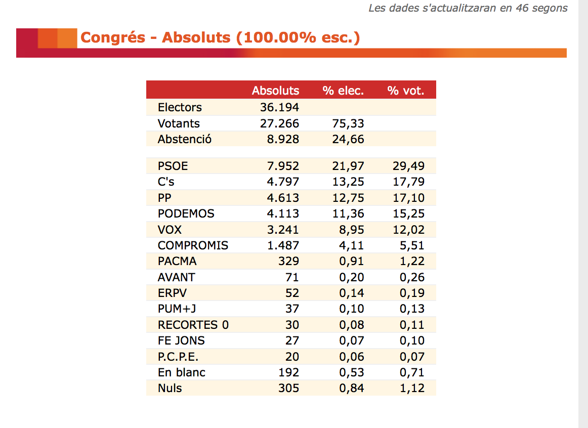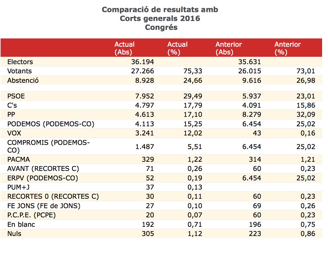 Al voltant de les 21.00 ha començat l’escrutini dels vots de les eleccions nacionals i a Vila-real el PSOE ha obtingut en el Congrés el 29,49% dels vots (7.952), recuperant-se enfront de les passades eleccions, en les quals va obtenir el 23,01%, i donant la presidència a Pedro Sánchez, que haurà d'arribar a acords i a alcances. Ciutadans ha 'furtat' el segon lloc amb el 17,79% dels vots (15,86% en 2016) al PP, que està en tercer lloc amb 17,10%, que cau en més de 4.000 vots, ja que va tenir 8.279 i en les del 28A ha obtingut 4.613. Podem el quart amb el 15,25%, enfront del 25,02 de 2016. Vox entra amb força al cinqué lloc amb el 12,02%, passant del 0,16% i Compromís obté un 5,51%, caient estrepitosament del 25,02 de les passades.