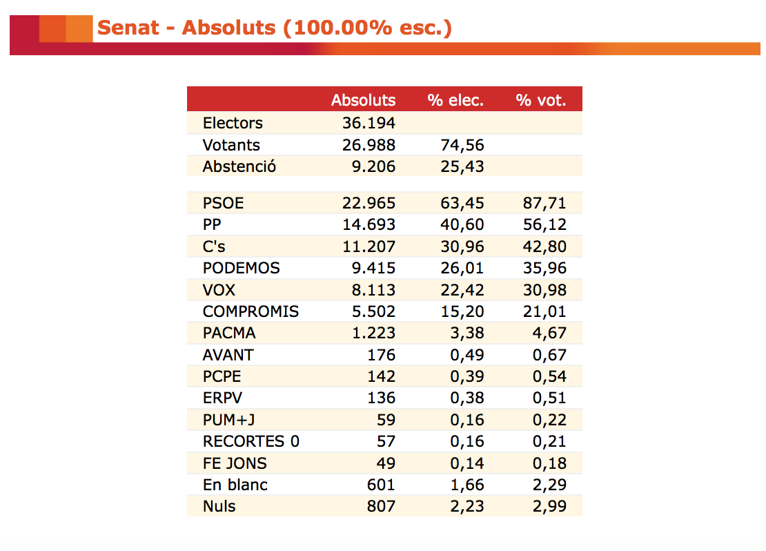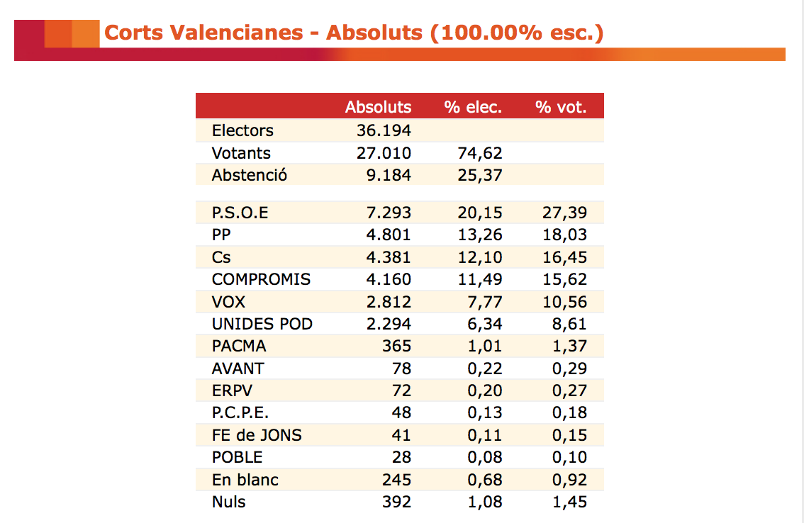 Els populars obtenen a la ciutat més de 4.000 vots menys i la formació valencianista baixa prop d'un 20%. La participació ha sigut del 75,33%, amb 27.268 persones enfront del 72,84% de 2016.