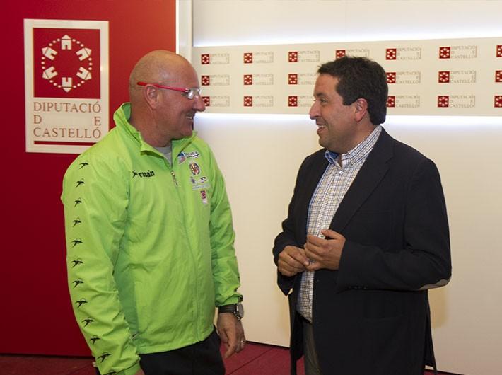 El Presidente de la Diputación de Castellón, Javier Moliner, ha recibido al entrenador del Playas de Castellón Claudio Veneziano, a quien le ha transmitido sus mejores deseos de cara a la próxima participación en el Campeonato del Mundo de Atletismo de Pista Cubierta, que tendrá lugar en Portland (EEUU) del 18 al 20 de marzo. El que también es profesor del Colegio Diputación de Penyeta Roja ha sido seleccionado como entrenador de los deportistas españoles para la modalidad de saltos. Por su parte, Pablo Torrijos (atleta seleccionado en la modalidad de triple salto) buscará la mínima para los Juegos Olímpicos de Río de Janeiro 2016 que es de 16,85 metros.