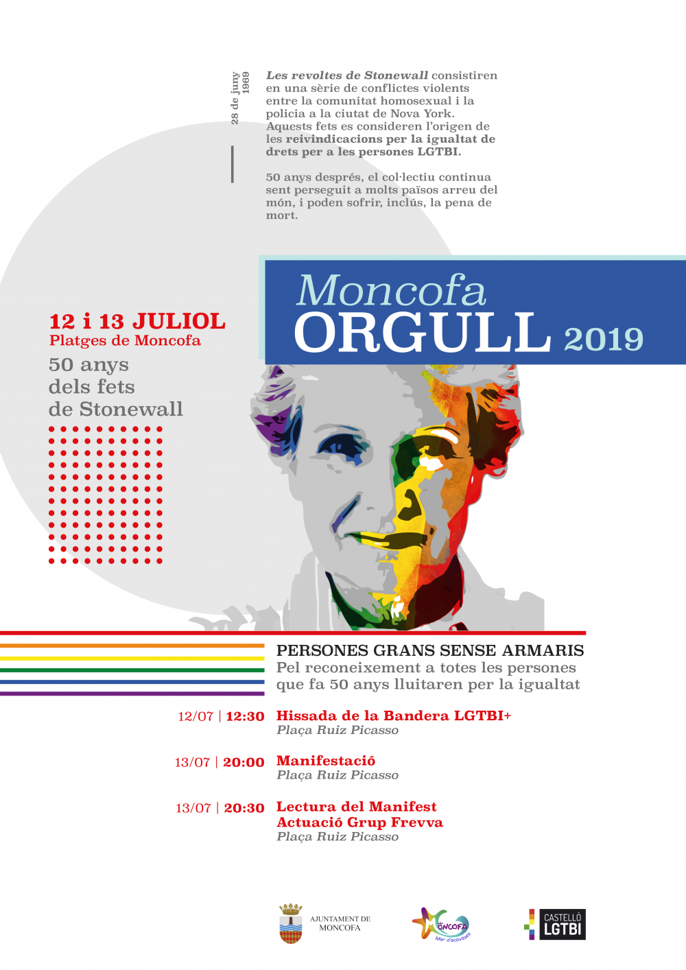 Un any més el municipi de Moncofa celebra l'Orgull en el municipi. Enguany es recorden les Revoltes d'Stonewell, que consistiren en una sèrie de conflictes violents entre la comunitat homosexual i la policia a la ciutat de Nova York. Aquests fets es consideraren l'origen de les reivindicacions per la igualtat de drets per a les persones LGTBI. 50 anys després, el col·lectiu continua sent perseguit a molts països arreu del món, i poden sofrir, inclús, la pena de mort.
