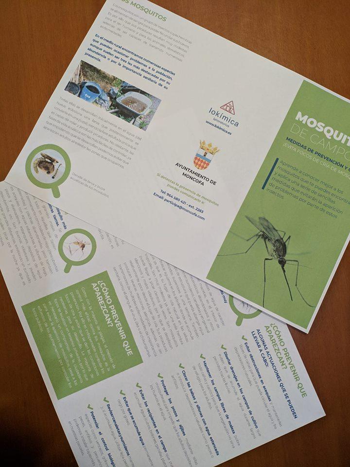 El Ayuntamiento de Moncofa ha encargado la confección de un tríptico que se repartirá entre los agricultores de la localidad con medidas explicativas de cómo luchar y prevenir la plaga de mosquitos de marjal, común y tigre. Después de la alarmante presencia de mosquitos del pasado año el Ayuntamiento, además de mantener la lucha contra esta plaga ha decidido confeccionar dicho folleto explicativo. La realización del folleto ha sido realizada por la principal empresa especializada en la lucha contra esta plaga, que es también la empresa encargada de la lucha contra los mosquitos en la localidad, Lokímica.