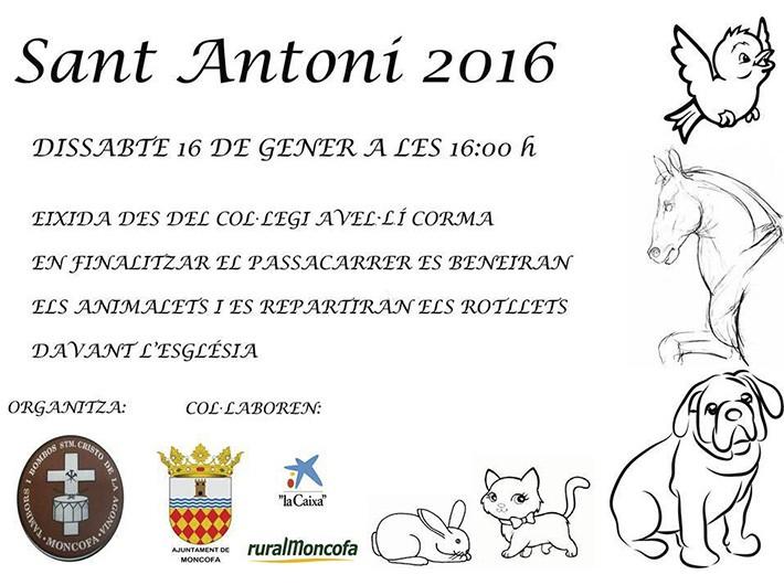 Moncofa celebra el sábado 16 de enero la festividad de Sant Antoni con el tradicional pasacalle y bendición de los animales. La Asociación de Tambors i Bombos Santíssim Crist de l'Agonia, en colaboración con el Ayuntamiento de Moncofa, prevé la salida del pasacalle a las 16 horas desde el CEIP Avel·lí Corma.