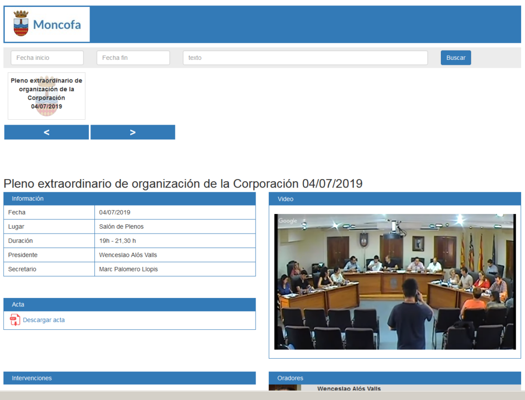 El equipo de gobierno actual del Ayuntamiento de Moncofa, quiere que todos sus vecinos tengan toda la información de la manera más clara y transparente posible. Para ello se ha desarrollado un nuevo sistema de gestión de actas municipales llamado VideoActa, que consiste en la posibilidad de visualizar completamente cada uno de los puntos tratados en el pleno, cuyos audios se encuentran certificados mediante firma electrónica..