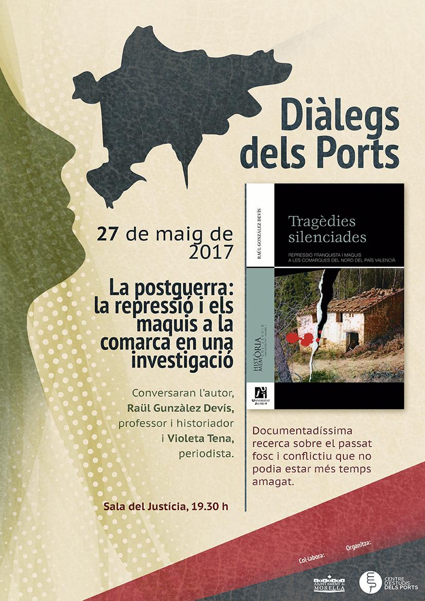 Esta nueva entrega de los Diàlegs dels Ports es el sábado 27 de mayo en la Sala de Justicia del ayuntamiento de Morella a las 19.30 horas. Así, la concejala de Cultura, Rocío Querol, ha agradecido "al Centro de Estudios dels Ports la organización de estas charlas que tratan, con la participación de expertos, de acercar y relacionar temas de actualidad al público general”. Además, Rocío ha valorado "muy positivamente el ciclo de diálogos que ha llenado de autores, libros y expertos en diferentes materias los fines de semana de Morella". Así, también ha recordado que "en esta última se trata un tema como es el de la memoria histórica en nuestra comarca que se debe conocer porque forma parte de nuestro pasado".