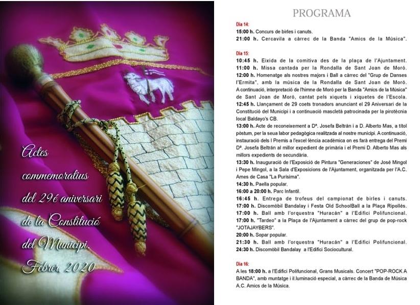 Sant Joan de Moró se este sábado en el escenario de una multitudinaria fiesta popular para conmemorar los primeros 29 años de la constitución del municipio. Una efeméride que, conocida popularmente como ‘la fiesta de la Segregación’, contará con numerosas actividades y festejos que ocuparan prácticamente toda la jornada de mañana, y que continuará el domingo (16 de Febrero) con un concierto, que tendrá lugar en el Edificio Polifuncional, en el que la banda Amics de la Música interpretará obras clásicas del rock en un concierto titulado Pop Rock a banda que será todo un espectáculo musical y luminotécnico.