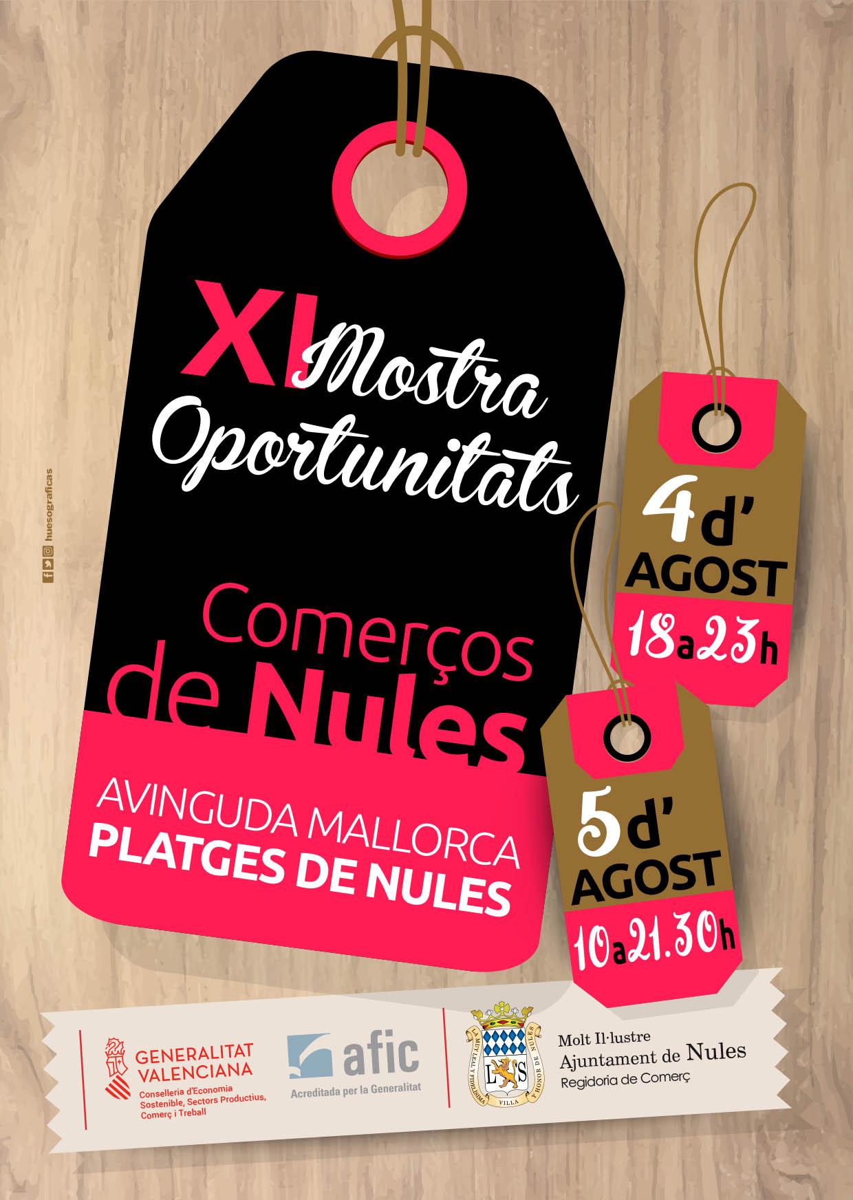 Des de la Regidoria de Comerç es destaca que amb aquesta iniciativa, que té una gran acceptació, es vol promocionar i acostar al ciutadà el comerç local, en traslladar-se a les platges de Nules. En concret la Mostra d’Oportunitats estarà oberta el dissabte 4 d’agost, de 18 a 23 hores, i el diumenge 5 d’agost, de 10 a 21.30 hores de manera ininterrompuda.