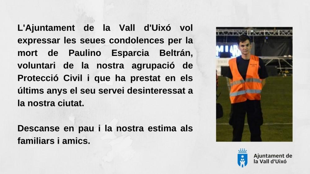 El Ayuntamiento y la Polícia Local de la Vall d’Uixó han expresado sus condolencias a la familia y amistades del vecino Paulino Esparcia Beltrán por su fallecimiento. El joven ha sido voluntario de la agrupación de Protección Civil y ha prestado en los últimos años su servicio desinteresado a la ciudad. De este