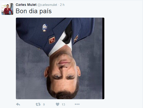 El senador de Castellón por Compromís Carles Mulet ha sorprendido hoy a sus seguidores en Twitter con un saludo muy especial para iniciar el día. Junto a la fase 'Bon dia país', Mulet ha publicado una foto del rey Felipe VI... boca abajo.