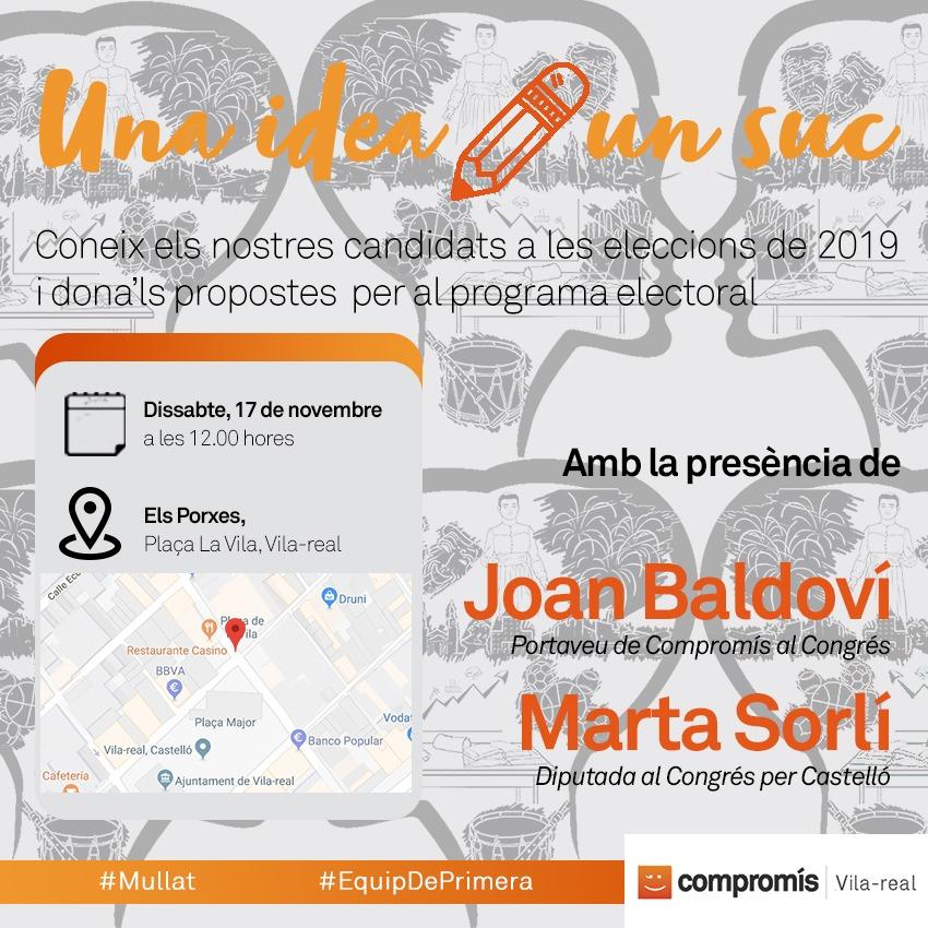 Els primers representants de la coalició que visitaran Vila-real seran el portaveu de Compromís al Congrés, Joan Baldoví, i la diputada al Congrés per Castelló, Marta Sorlí, que estaran des de les 12.00 hores a la plaça Major donant suport al candidat a l'Alcaldia de Vila-real, Josep Pasqual Sancho, i membres de l'equip i militants, per a escoltar les propostes dels ciutadans per al programa electoral.
