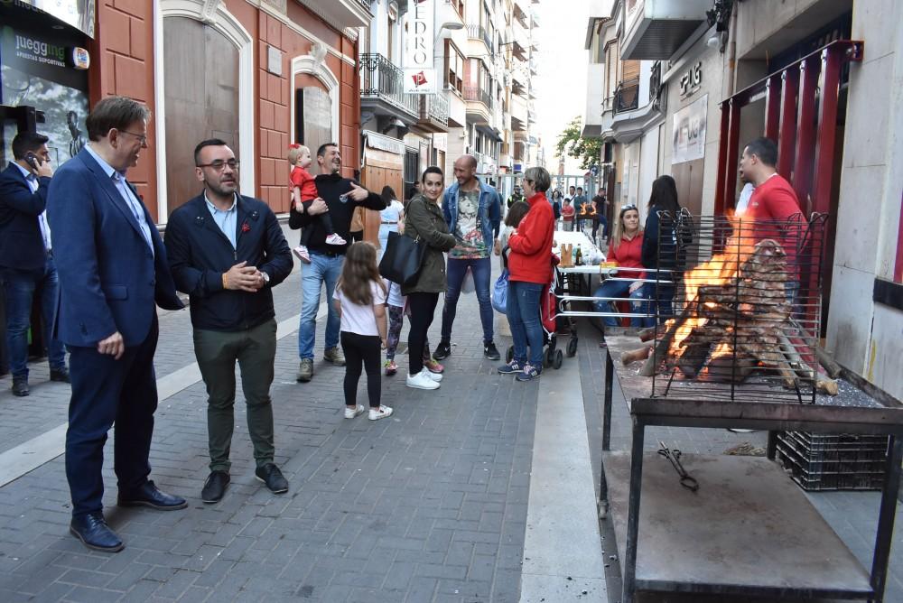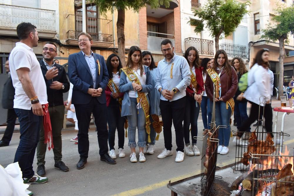 Festa d'Interés Turístic Provincial. Sebastià ha estat acompanyat pel candidat a l'Alcaldia, Josep Pasqual Sancho, i la resta de membres de l'equip, que li han mostrat com és aquesta celebració i com es viu a les penyes de la ciutat, que també han rebut la visita dels candidats.