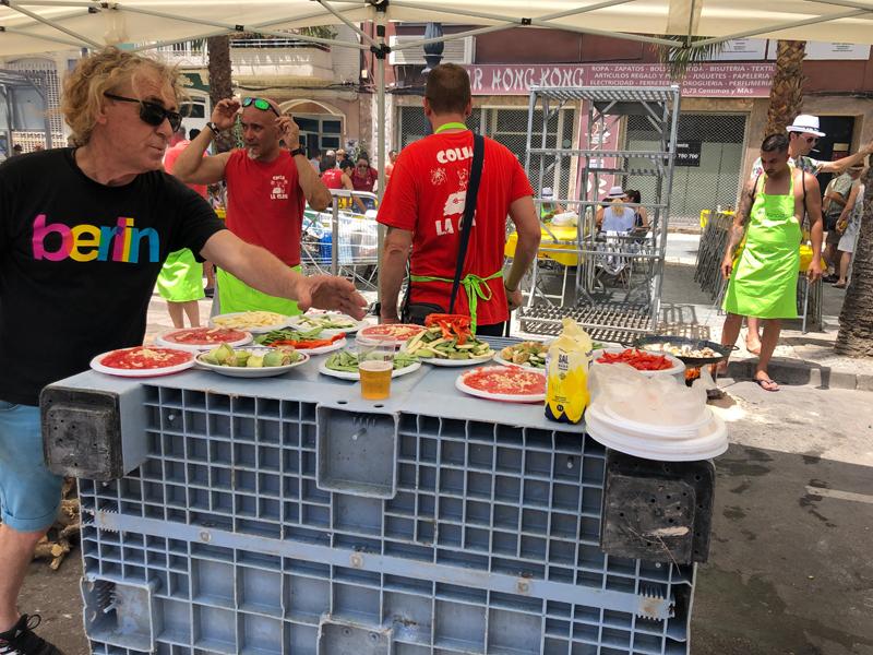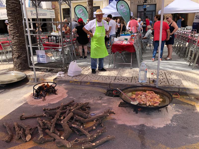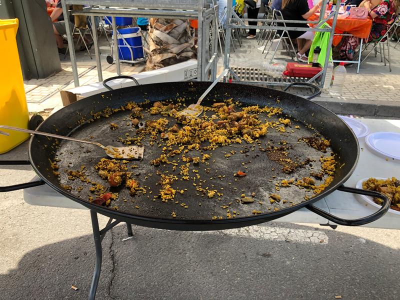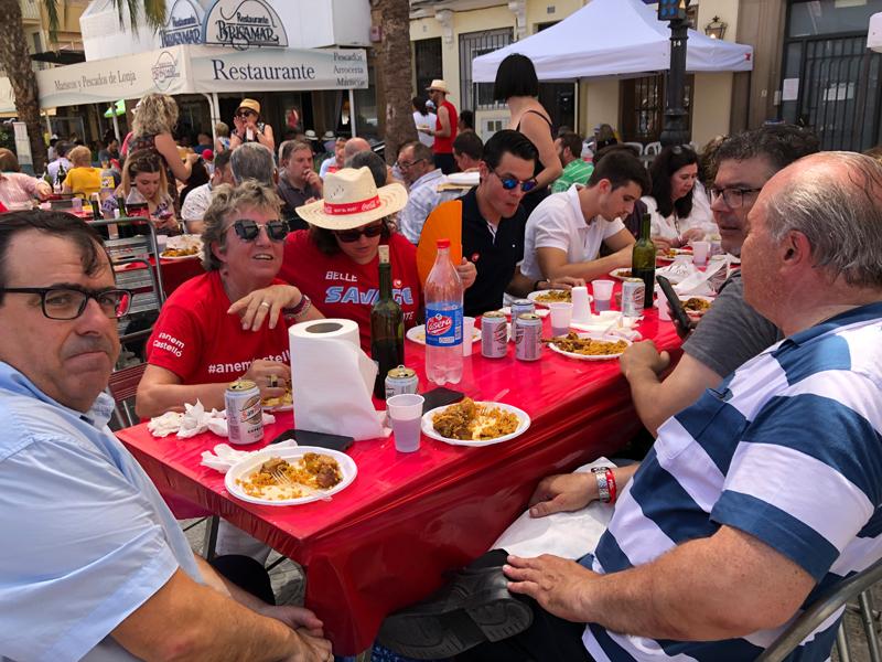 De mesas, había muchísimas, casi imposibles de contar, ya que ocupaban casi toda la acera del paseo Buenavista y las calles que desembocaban en él. Eso sí, parte de la avenida se dejaba libre para el trasiego de personas y materiales y, desde un punto de vista alejado y privilegiado, se podía ver como iban avanzando las paellas: algunos tenían lista la carne, otros, la verdura y, otros, que ni habían empezado, preferían pasar antes un buen rato en la mesa.