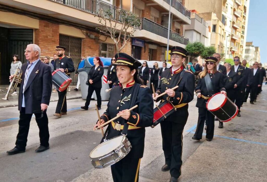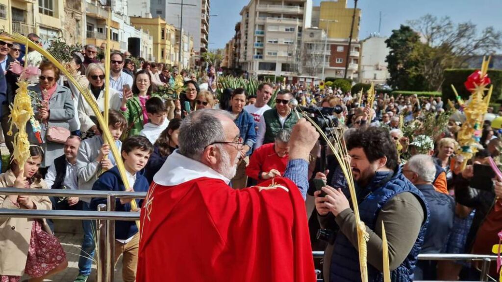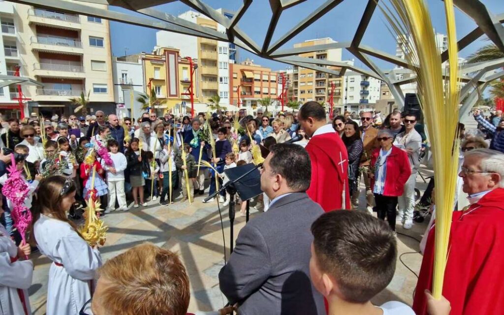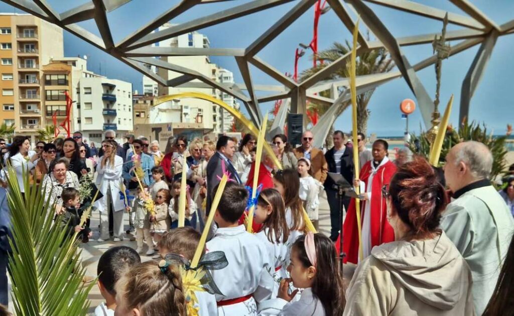 La parroquia de la Asunción bendijo los ramos en el paseo marítimo por parte del arcipreste Emili Vinaixa. Al finalizar se iniciaba una procesión de subida al templo con los bombos de la Cofradía del Cristo de la Paz hasta la iglesia arciprestal, en la que entraron por la puerta plateresca.