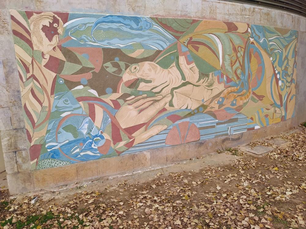 El mural en el parque Rafalafena fue elaborado por la cooperativa Okambuva con la colaboración de voluntarios apuntados durante la II Jornades Construint i Alimentant Alternatives. La actividad consistió en una práctica de muralismo y esgrafiado con cal procedente de una empresa del entorno.