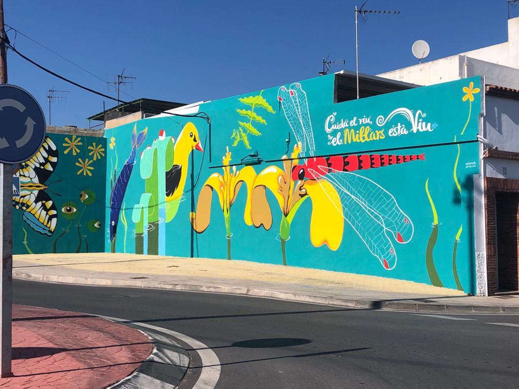 Vila-real suma un altre murali enriqueix més encara el seu patrimoni artístic a l’aire lliure. En aquesta ocasió s’ha aprofitat una paret situada en la nova rotonda del Camí Vell Castelló-Ondaperreivindicar la biodiversitat d’un paratge molt proper,el Riu Millars i l’artista que li ha donat és la il·lustradora Anna Dobón,que assegura haver plasmat la seua “visió personal en un mur amb algunes de les espècies animals i vegetals representades, el barb, l'oriol, el pixaví, la papallona, el lliri groc, dent de lleó i el color de l'aigua verdosa tan característica d'aquest camí d'aigua que ha regat les nostres vides”. El lema de la il·lustració,'Cuida el riu, el Millars està viu'.