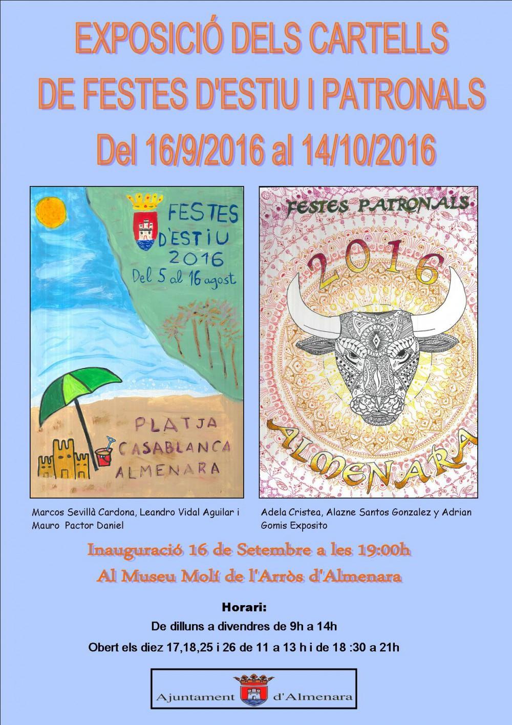 El Museu del Molí d'Arròs de Almenara acogerá dos exposiciones a partir del próximo viernes 16 de septiembre, coincidiendo con el inicio de la s fiestas de la localidad, y que se prolongarán hasta el 14 de octubre. La primera, ya tradicional será la de los carteles elaborados para el concurso de portadas para los libros de fiestas de la localidad, tanto las de verano de la playa Casablanca como las patronales que se celebran este mes de septiembre.
