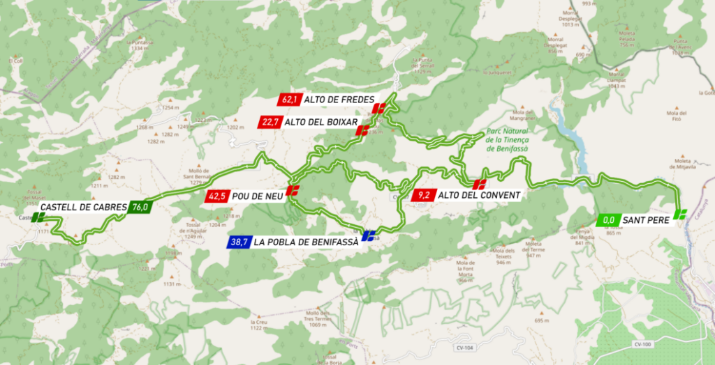 Los corredores deberán afrontar un duro recorrido por las carreteras del paraje natural de 76 kilómetros y 2.000 metros de desnivel positivos. La salida tendrá lugar desde la Font de Sant Pere del Ballestar a las 11 de la mañana. Los ciclistas deberán ascender en primer lugar el Alto del Convent (km 9,2) de tercera categoría, seguido del Alto del Boixar (km 22,6), de primera categoría, seleccionando el grupo principal. Una rápida bajada desde Fredes hasta la Pobla de Benifassà, donde se disputará la única meta volante de la jornada (km 38,6) y dará comienzo a la subida más temible, Pou de Neu (km 42,5), de primera categoría, con 2,7km a una media del 12,4%, una verdadera pared inédita para el ciclismo de competición.