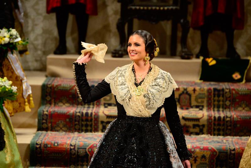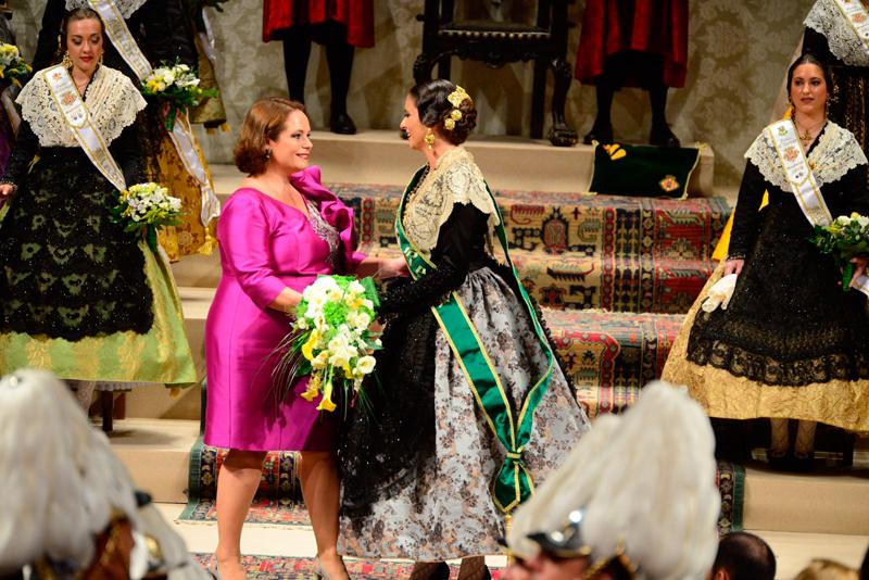 Sorpresa y sonrisas de Natalia cuando Andrés Bort, tantas veces presidente de su gaiata, la 1, Brancal de la Ciutat, fue el encargado de poner a los pies de la reina el cojín mágico de la confianza...