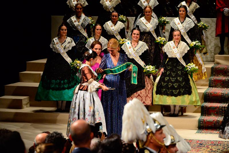 Tras su presentación como reinas en un acto celebrado en la Diputación, la escenificación se completaba con uno de los eventos más emocionantes, aquel en el que las damas de la ciudad son investidas con su banda blanca, y en la que la reina de la Magdalena recibe de manos de la alcaldesa la banda verde, el símbolo más importante para una mujer castellonera que, desde esta noche deberá representar a Castellón y a toda su ciudadanía.