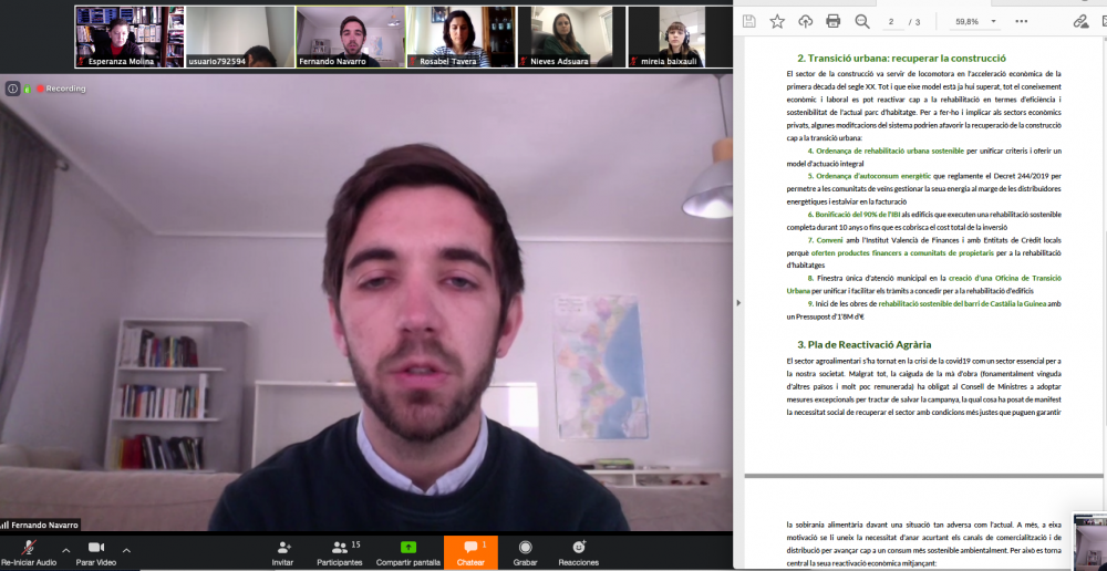 Navarro entiende que las consecuencias del Covid-19 pueden producir un retroceso muy elevado que alcance incluso el 10% del Producto Interior Bruto (PIB). Una situación que afectará gravemente a la sociedad, y al empleo, pero que también puede aprovecharse para un verdadera renovación ecológica de la ciudad.