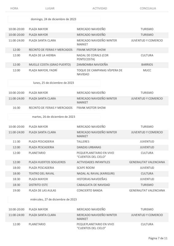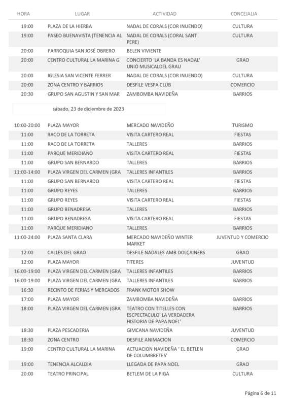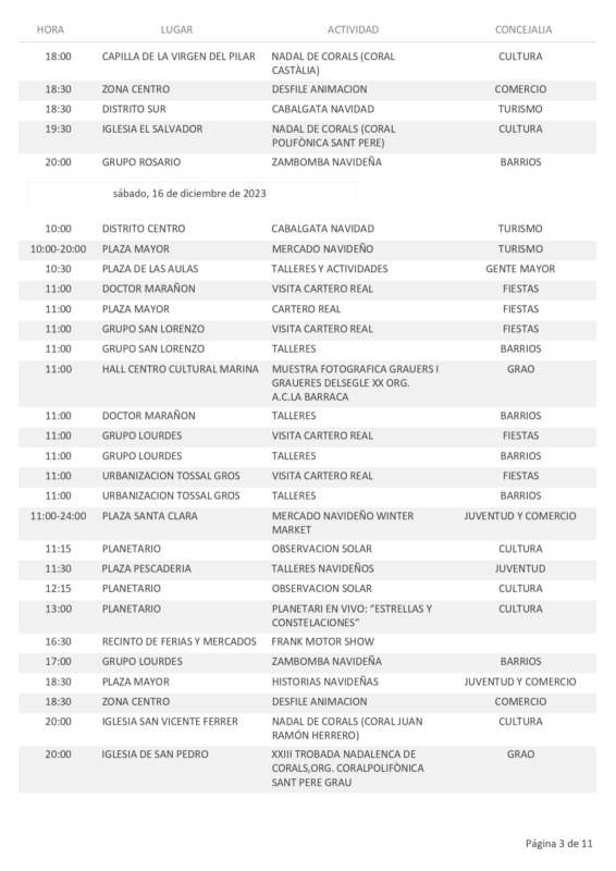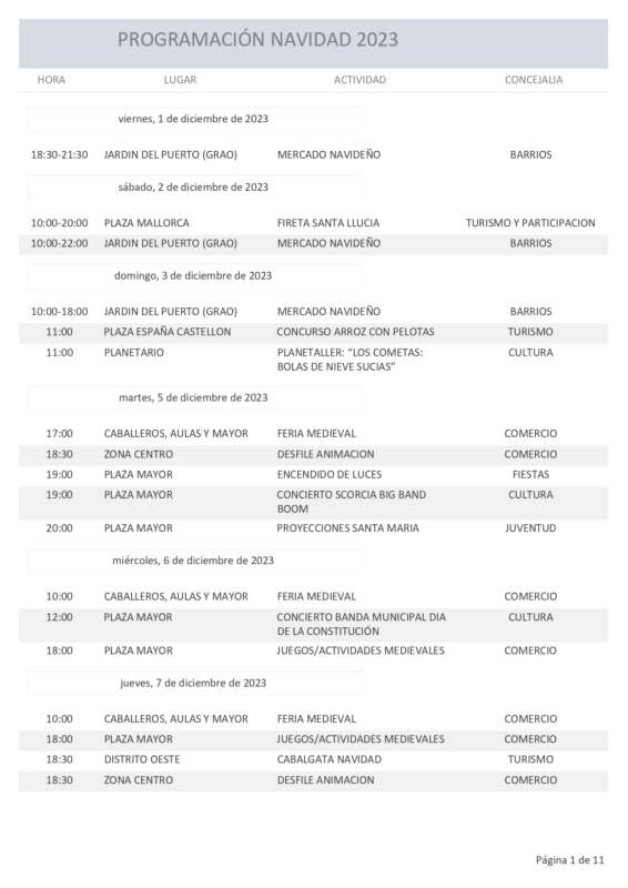 Entre ellos destacan las zambombas navideñas y desfiles en cada uno de los seis distritos que ambientarán la ciudad de norte a sur con la visita de Papá Noel junto a sus renos y elfos. Esta última actividad está prevista que se realice el día 7 (distrito oeste), 15 (sur), 16 (centro), 22 (norte), 23 (Grao) y 26 (este).