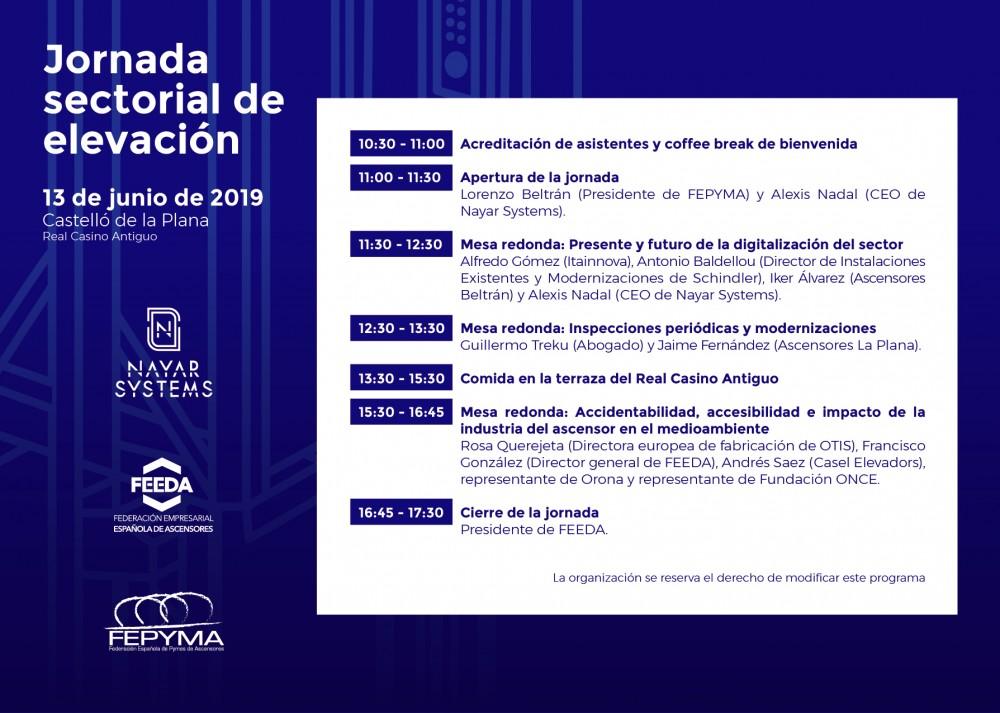 El jueves 13 de junio, numerosos profesionales relacionados con el sector de la elevación se reunirán en el Real Casino Antiguo de Castelló de la Plana, donde tendrá lugar la Jornada sectorial de elevación organizada por FEEDA, la Federación Empresarial Española de Ascensores y por FEPYMA, la Federación Española de Pequeñas y Medianas Empresas Ascensoristas.