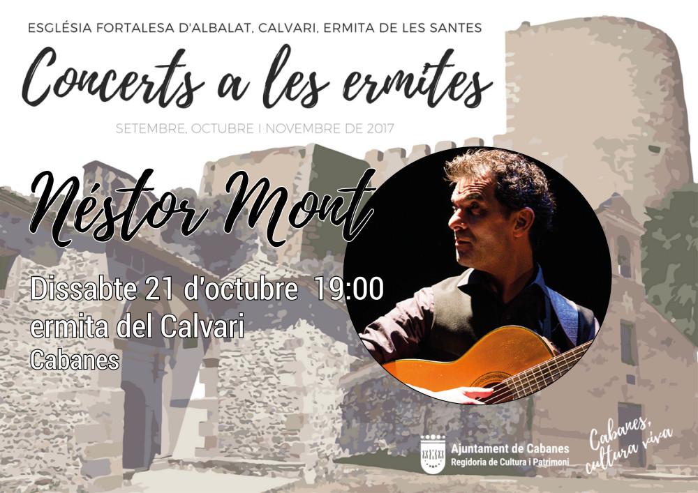 El cantautor en valencià Néstor Mont protagonitzarà este dissabte la segona jornada dels concerts a les ermites de Cabanes, en aquesta ocasió a l'ermita del Calvari del municipi. Aquesta serà la segona activitat dels concerts organitzar per la regidoria de Cultura de Cabanes, a càrrec del seu responsable Carles Mulet, que ha volgut aprofitar l'oportunitat que donen aquests edificis religiosos per usar-los con inaudit auditori musical oberta a tota la població. Junt al Calvari, ja ha sigut protagonista d'aquests concerts l'església fortalesa d'Albalat a la Ribera de Cabanes amb el cantautor castellonenc Joan Villalonga i finalitzarà el pròxim mes a l'ermita de les Santes amb el cantador valencià Jonatan Penalba.