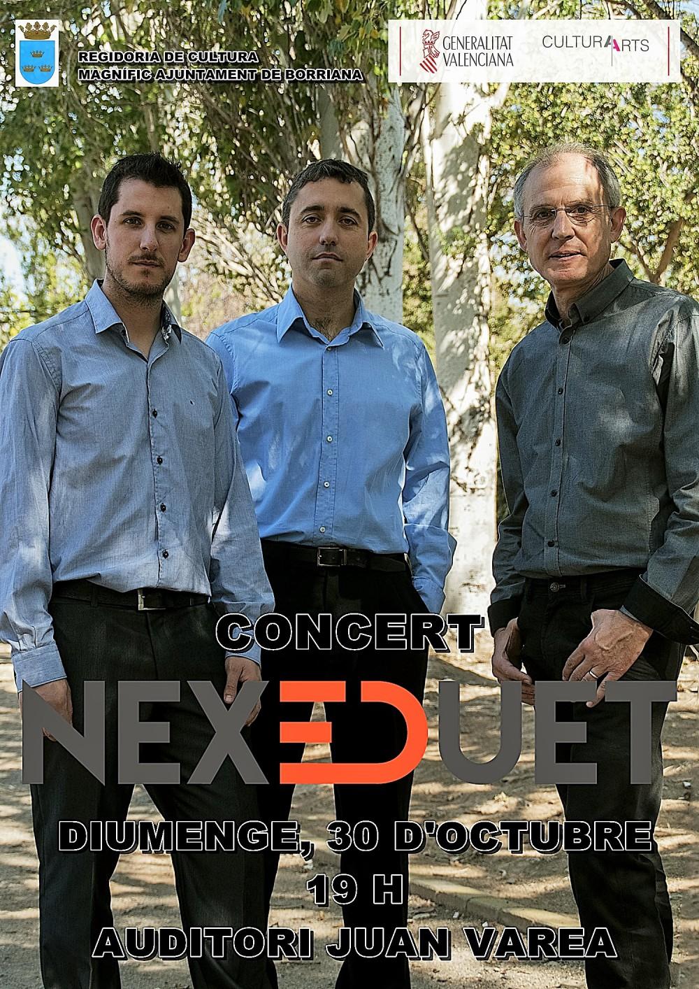 L'Auditori Juan Varea acollirà el pròxim diumenge dia 30 d'octubre, a les 19 h, el concert del trio de percussió contemporània NEXEduet. Este concert substitueix en dia i hora a l'inicialment programat del Grup Duboig, que per motius aliens a la Regidoria de Cultura no podrà portar endavant la seua actuació.