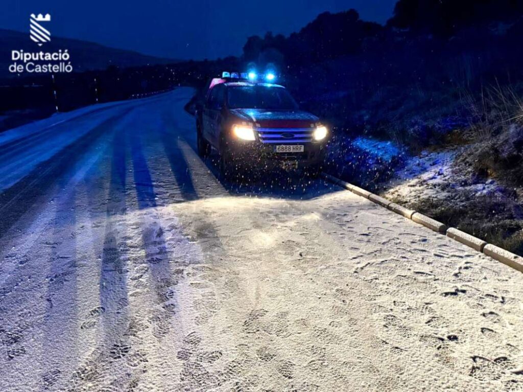 Aemet también informa de una ligera nevada en el interior de Castellón que apenas ha cubierto el suelo. Con estas temperaturas tan bajas el peligro son las placas de hielo que se puedan formar con lo que se apela al sentido común y a la máxima precaución en carretera en el interior de Castellón.