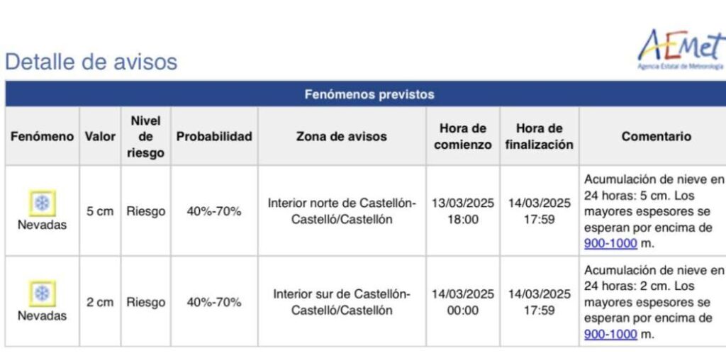 Hay que recordar que desde la Aemet de la Comunitat Valencia prevé para este viernes nevadas en todo en interior de la provincia de Castellón a partir de los 900-1.000 metros de altura, con acumulados que pueden llegar a los 2-5 centímetros, puntualmente en cotas altas, donde podría ser superior esa cota.
