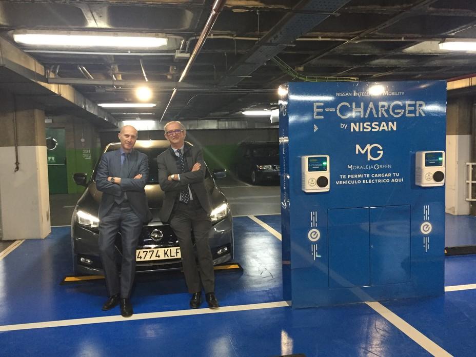 Nissan y Moraleja Green han firmado un Acuerdo para el despliegue de infraestructura de recarga para vehículos eléctricos en el aparcamiento del Centro Comercial Moraleja Green situado en la localidad de Alcobendas (Madrid). Con ello se persigue favorecer la implantación de la movilidad eléctrica en aquellos lugares que aglutinan zonas de ocio, alimentación, etc y donde los vehículos pasan un tiempo medio de estacionamiento de dos horas, que puede ser aprovechado para recargar el vehículo eléctrico.