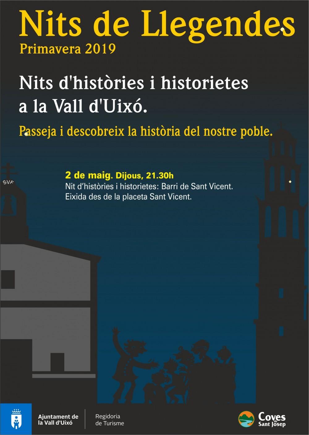 El Ayuntamiento de la Vall d'Uixó ha presentado la primera actividad del ciclo 'Nits d'històries i historietes'. Será el jueves 2 de mayo a las 21.30 horas y realizará un recorrido guiado por el barrio Sant Vicent, "para conocer su historia, las leyendas que se cuentan y sus edificios y elementos patrimoniales, tanto los que están como los que ya han desaparecido", tal y como ha explicado el concejal de Turismo, Higi Daniel.