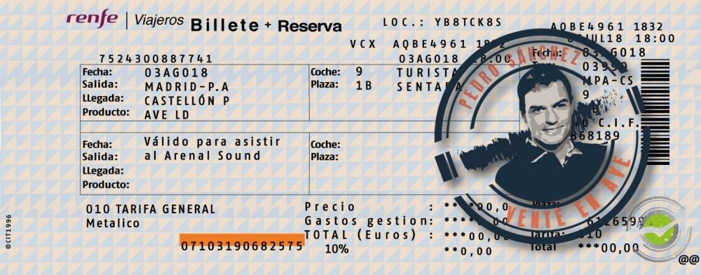 NNGG ha remitido un billete de AVE a Pedro Sánchez para que el próximo 3 de agosto acuda al Arenal Sound de Burriana "y no tenga que hacerlo en el avión Falcon cargando un gasto de más de 15.000 euros a las arcas públicas".