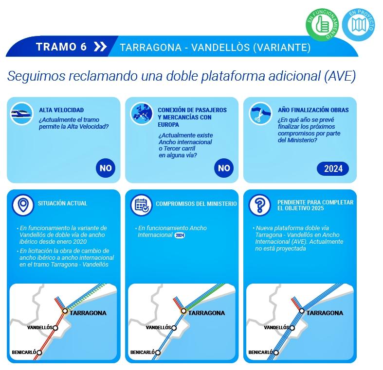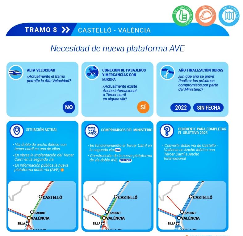 Durante el acto se ha dado a conocer el Segundo Chequeo Semestral para mostrar el estado de ejecución de las obras y las actuaciones pendientes. Se han detectado todavía cinco hitos pendientes para 2021: la finalización de las obras del túnel de Castellbisbal (Barcelona); la adjudicación del cambio de ancho entre Tarragona y Castelló; el tramo Murcia-Cartagena y el bypass del Reguerón (proyecto en redacción); la licitación de las obras en Totana (Murcia); y el tramo Almería-Granada, que está en estudio y pendiente de proyecto.