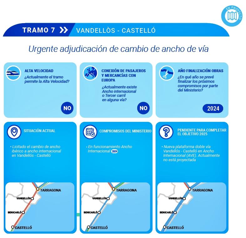 Durante su intervención, la ministra ha hecho una perspectiva positiva de su desarrollo a corto plazo, dado que se prevé que, para 2023 entre otros hitos logrados, los ciudadanos de Murcia podrán viajar más rápida y cómodamente a Madrid, Albacete, Cuenca y todo el norte de España; se conseguirá conectar el puerto de Tarragona y todo el clúster industrial del Camp directamente con el resto de Europa; el fin de las obras de implantación de ancho mixto entre Castellbisbal-Vilaseca; y que los servicios de alta velocidad entre Valencia y Castellón dejen de interferir en los servicios de cercanías.
