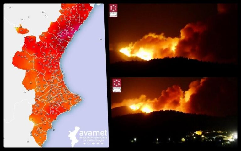 Noche tórrida en la provincia de Castelló, donde las temperaturas han llegado a los 40 grados a la una de la madrugada, tanto en el interior como en el litoral, con mediciones de 39,7 grados en zonas como el municipio de Benicàssim. El viento de poniente ha provocado situaciones desconocidas, en las que verdaderas 'olas de fuego' han sacudido a la población. Esta situación ha sido también la que ha provocado el incendio en el término municipal de Azuebar, donde todavía no se ha podido controlar el fuego.