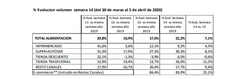 En esta semana 14, el incremento del consumo es generalizado para la mayoría de los productos en comparación con la misma semana de 2019. No obstante, no se está comprando más en todas las categorías con relación a la