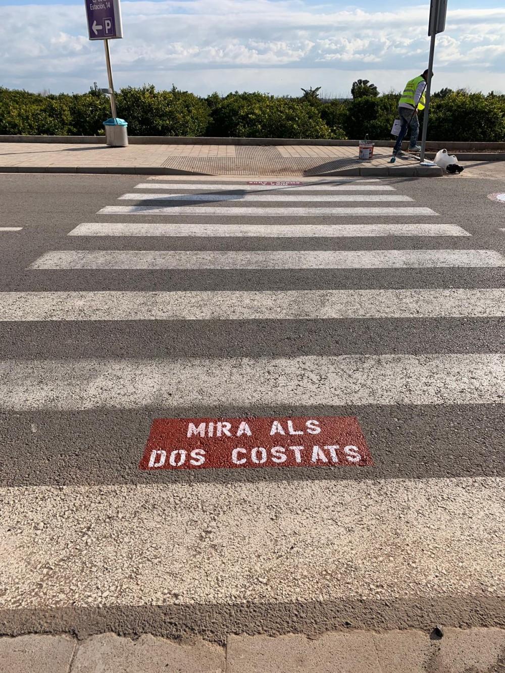 Aquests cartells retolats en el sòl s'han pintat al carrer Enric Valor aprofitant la col·locació de guals, però s'estendran a altres punts transitats de la localitat i de la platja. Així per exemple es podran veure pròximament en l'Avinguda País Valencià així com a l'entorn dels centres escolars.