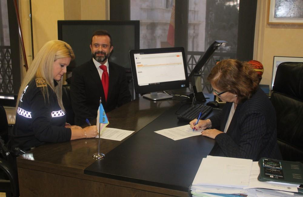 La nueva agente fue felicitada por el concejal del área de Seguridad y Policía Local, Javier Güal y la alcaldesa, María Josep Safont