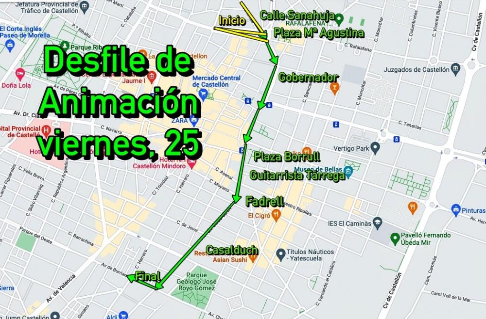 El Gran Desfile de animación tendrá lugar el viernes, 25 de marzo a partir de las 18:30 horas. Los participantes se darán cita en las calles Sanhuja, Conde Pestagua y San Luís. El desfile comenzará a las 10:30 de la mañana con el siguiente recorrido: Mª Agustina, Gobernador, Plaza Borrull, Guitarrista Tárrega, Plaza Fadrell y avenida Casalduch hasta la esquina con avenida de Burriana.