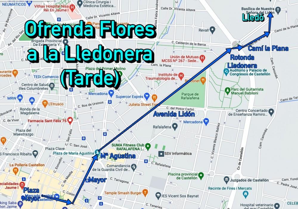 Por la mañana, la primera parte saldrá de Mª Agustina a las 10:30. Por la tarde, lo hará a las 17:00 horas de la Plaza Mayor. Si el tramo de la avenida de Lidón, que ahora se encuentra en obras, está libre y limpio, el recorrido será el habitual, por la avenida de Lidón hasta la Basílica. En caso contrario, los recorridos alternativos pasarán por Camí la Plana y Caminás hasta la basílica.