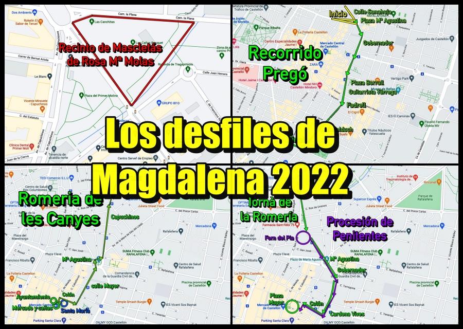 Las fiestas de la Magdalena 2022 estrenarán nuevos recorridos por calles más anchas parra evitar aglomeraciones e incrementar la seguridad de los castellonenses. Generalmente, el montaje de los desfiles se realizará en las calles Sanhuja, Conde Pestagua y San Luís, y comenzarán en la plaza Mª Agustina, ‘a la antigua usanza’, en sentido contrario a la dirección de tráfico actual. Las Collas tendrán un lugar propio y la tribuna de Autoridades estará en la plaza Na Violant D’ Hongría.
