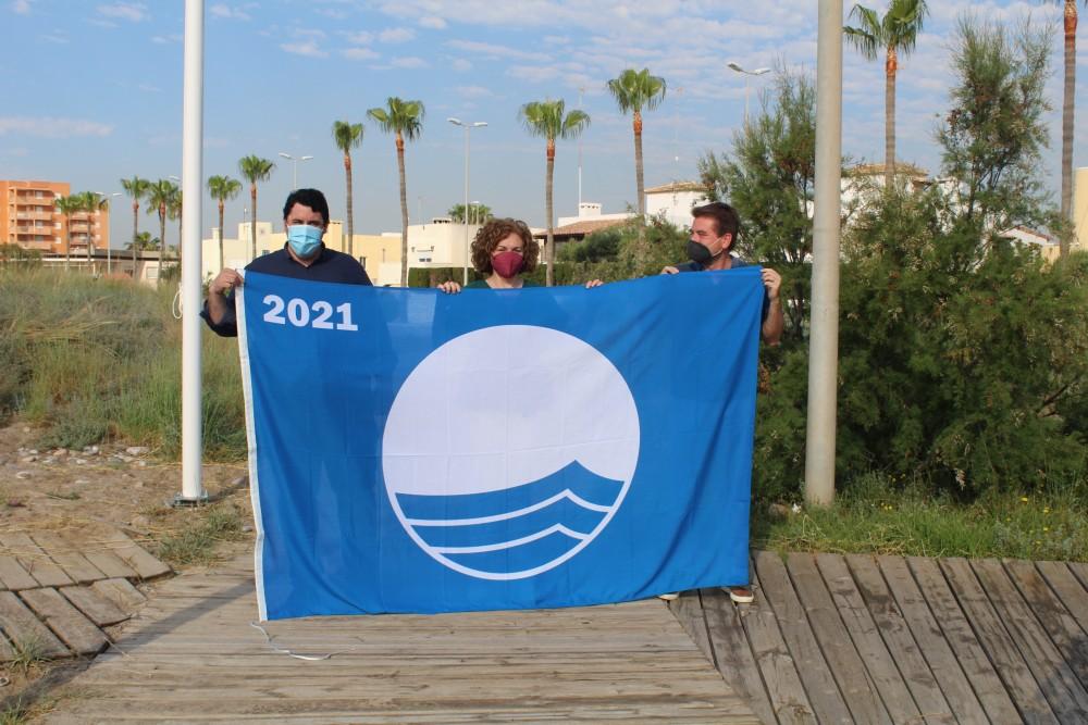 La bandera blava de la platja de les Marines ja oneja a Nules després de la seua hissada que ha tingut lloc hui dijous amb l’assistència de l’alcalde, David García, de la regidora de Platges, M. José Esteban, i del regidor de Medi Ambient, César Estañol.