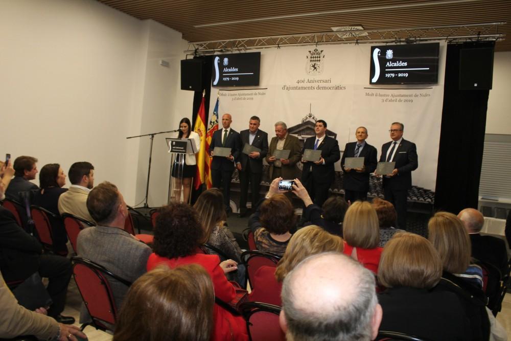 Nules s’ha sumat en el dia d’avui a la celebració i commemoració del quarantè aniversari d’ajuntaments democràtics amb un acte institucional que ha reunit a tots els alcaldes i regidors i regidores de les corporacions municipals de les deu legislatures: Vicente Porcar que va governar en la legislatura 1979-1983; Vicente Martínez Lucas, alcalde dels anys 1987 a 1999; José-Blas Molés qui va ostentar l’alcaldia la legislatura 1999-2003; Salvador Górriz, alcalde de Nules al llarg dels anys 2003 a 2007; Mario García qui va presidir l’Ajuntament de Nules les legislatures dels anys 2007 a 2015; i David García, alcalde en la present legislatura. A més, s’ha fet menció a Sebastià Nebot i José Darás ja morts i que van ser alcalde en la legislatura dels anys 1983 a 1987 i 1979-1983, respectivament.