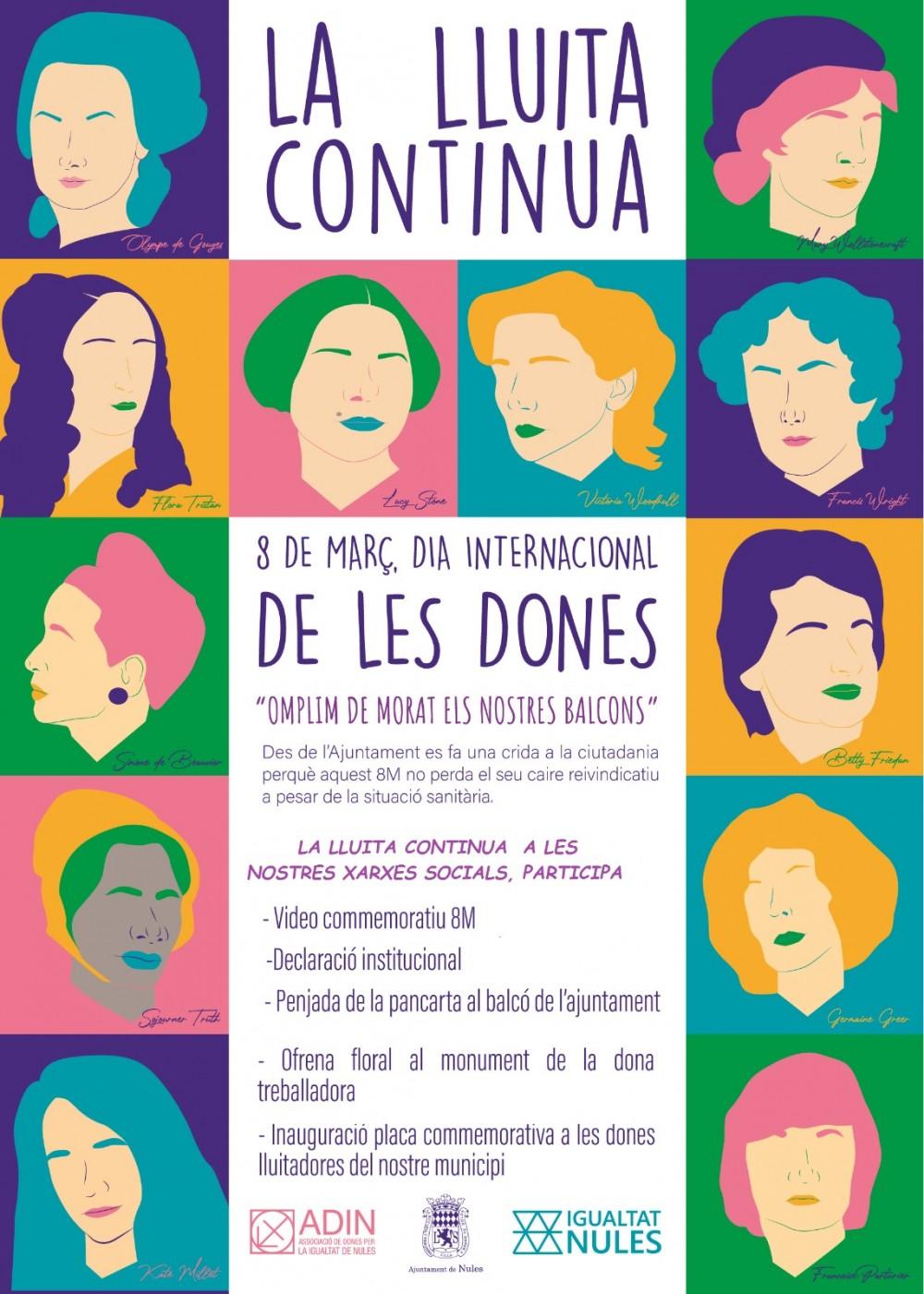 La lluita continua, és el lema que porta el cartell commemoratiu del Dia Internacional de les Dones que se celebra el pròxim 8 de març, i que enguany a Nules se li ha donat un enfocament diferent degut a la conjuntura sanitària.