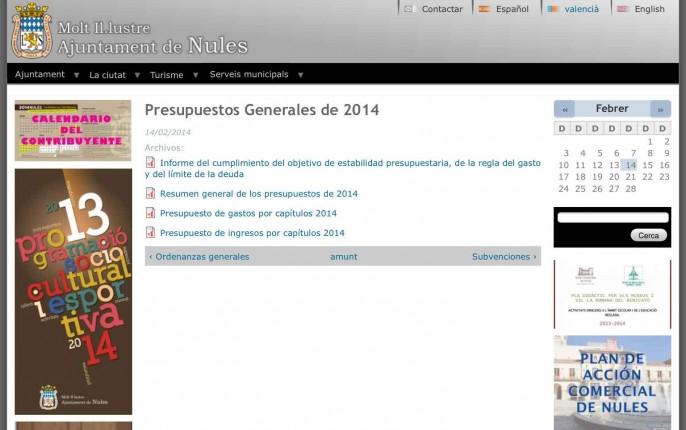Los presupuestos del Ayuntamiento de Nules para el año 2014 están a disposición de todos los vecinos de la localidad a través de la web municipal, con lo que el alcalde, Mario García, cumple con el compromiso que adquirió en su día de “dar la mayor difusión posible a las cuentas municipales”.