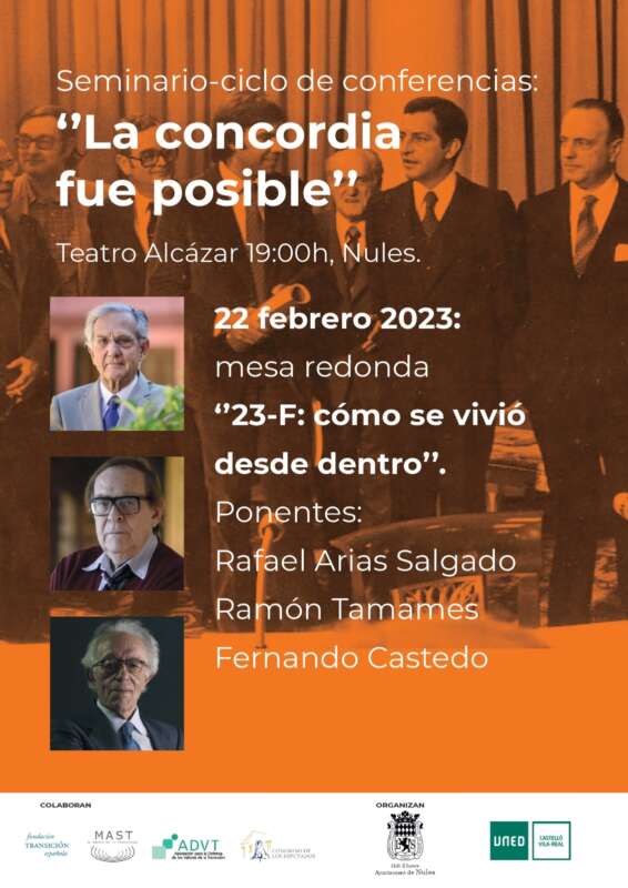 Nules albergarà aquest dimecres, 22 de febrer, una nova jornada del cicle de conferències “La concordia fue posible”. En concret, tindrà lloc una taula redona anomenada “23-F: cómo se vivió desde dentro” protagonitzada per Fernando Castedo, director de RTVE durant el 23-F; Ramón Tamames, diputat del PCE durant el 23-F; i Rafael Arias–Salgado, ministre de la Presidència del Govern d’Espanya durant el 23-F.