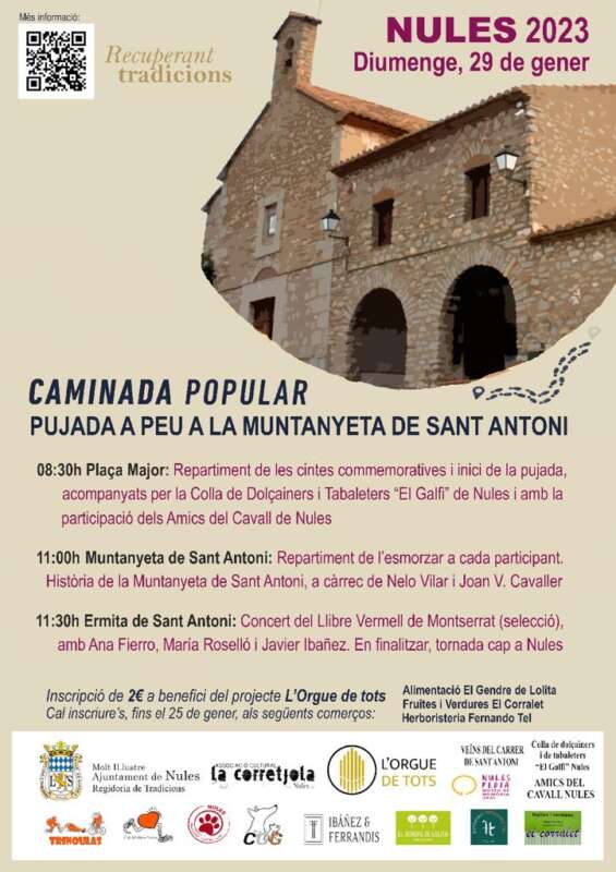 La localitat de Nules recupera una antiga tradició com és la pujada a peu a la Muntanyeta de Sant Antoni de Betxí, una activitat que està impulsada per l’Associació Cultural La Corretjola, l’Associació l’Orgue de Tots, i el veïnat del carrer de Sant Antoni, que compta amb el patrocini i suport de la regidoria de Tradicions de l’Ajuntament de Nules.