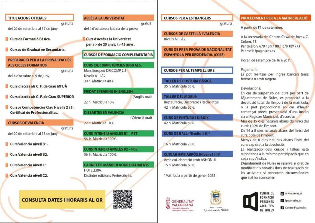 D’altra banda, el Centre de Formació de Persones Adultes també presenta una variada programació de formació complementària amb cursos d’anglès B1 i B2, i de Competències Digitals A1 i A2, entre altres. També compta amb cursos per al temps lliure i d’activitats d’oci amb tallers de pintura i dibuix, cuina, restauració de mobles, costura, o ball que tenen ampla participació entre la població de Nules i de la comarca. Per a inscriu-se en aquests cursos hi ha que abonar una matrícula que varia segons el curs.