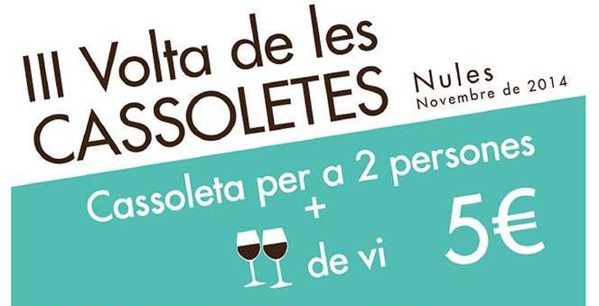 La III Volta de les Cassoletes se celebrará durante los fines de semana de noviembre y en ella participan los locales que integran la Associació d’Hostalers, Parris II, Mingo, Bar-Restaurante Taurino, El Celler de Rabitas, Bar Bocatería-Tapería Musical, Restaurante Caixa Rural Nules, Casa Manu, Ca Pere y Casa Rabitas, cada uno propondrá una receta distinta.