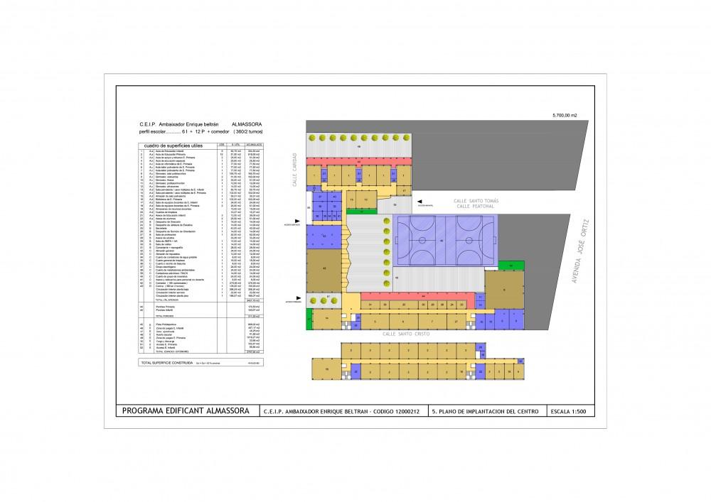 En el cas de l'Ambaixador Beltrán, el pressupost inclou també la demolició dels antics habitatges de mestres i els blocs actuals per a crear una zona diàfana, més àmplia que l'actual, en la qual construir el futur Ambaixador Beltrán sobre una superfície de 5.700 metres quadrats. En concret, el centre educatiu comptarà amb 3.427 metres quadrats de superfície construïda, 2.767 metres quadrats d'espais exteriors i 311,20 metres quadres de porxos.